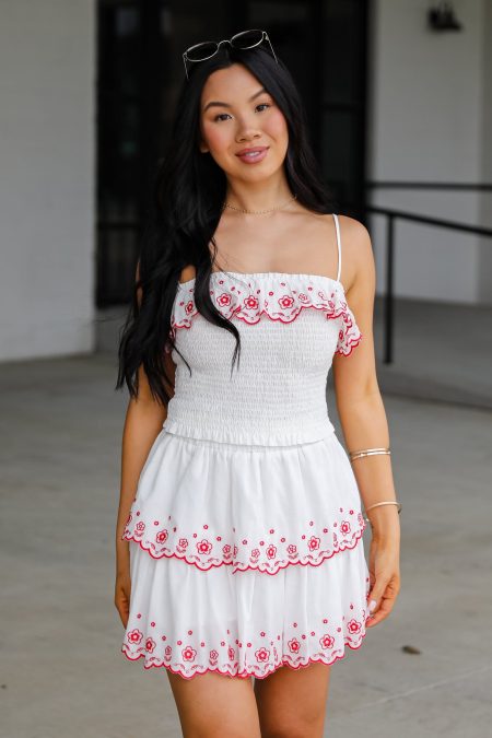 Bring on the sunshine in the American Summer White Tiered Skort! This breezy beauty features soft, flowing tiers and an elastic waistband for a comfy, flattering fit that moves with you. Delicate red floral embroidery and scalloped edging along the hem add a romantic, eye-catching touch to this warm-weather favorite.…